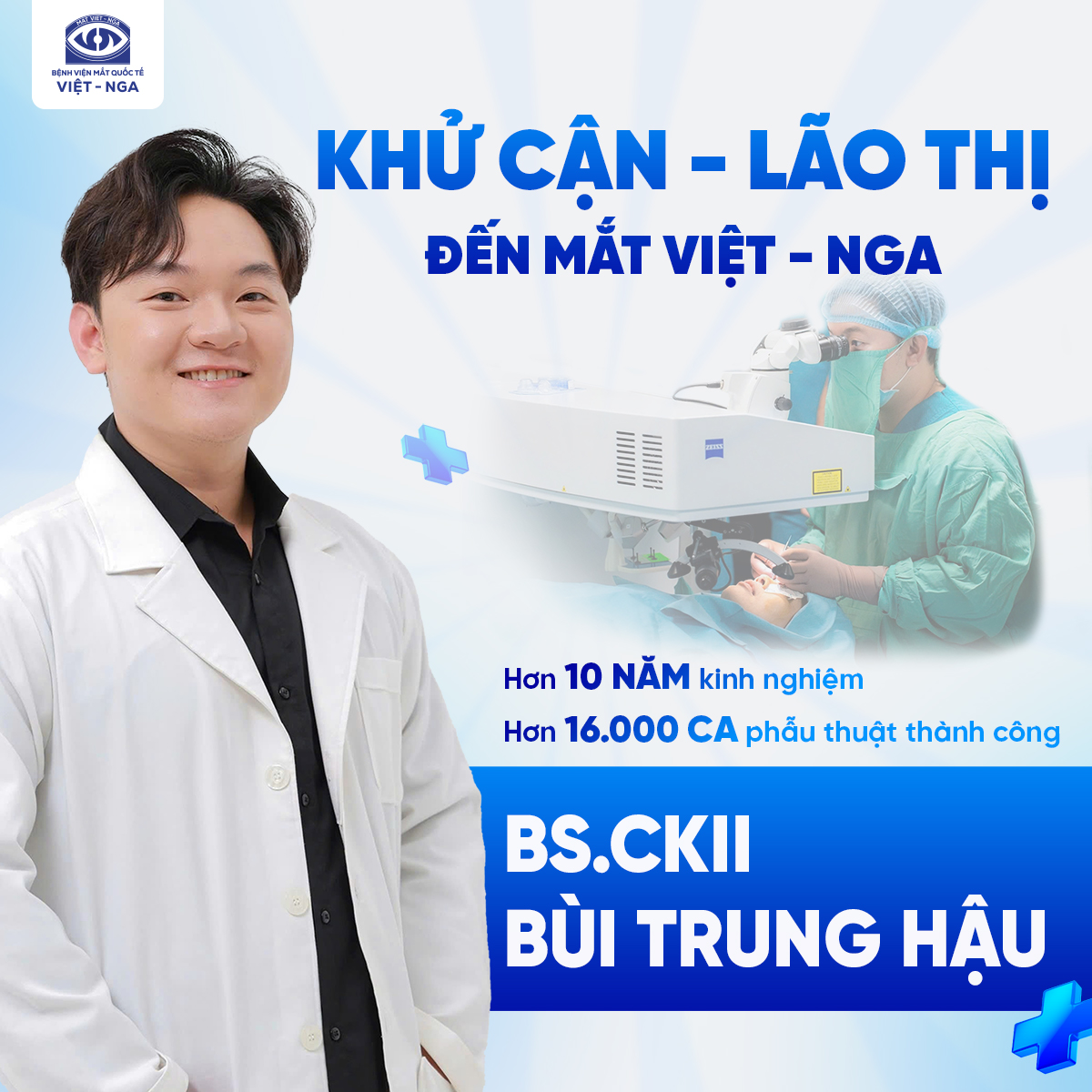 Trong đó, BS.CKII Bùi Trung Hậu là chuyên gia trong lĩnh vực điều trị Lão thị với hơn 10 năm kinh nghiệm trong ngành, mổ thành công hơn 16.000 ca Phaco, Lasik, Phakic, Lão thị. Bên cạnh đó, bác Hậu còn là thành viên ban giảng huấn phẫu thuật Khúc xạ tại các bệnh viện tuyến đầu, đã tham gia báo cáo, chia sẻ kinh nghiệm tại rất nhiều hội nghị Nhãn khoa toàn quốc, các hội nghị trong nước và hội nghị chuyên gia khúc xạ tại Singapore